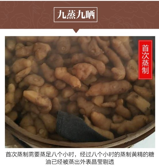 我们严格遵循九蒸九晒的古法工艺,坚持全程传统手工炮制,摒弃现代加工方法。历经九次反复蒸制与晾晒,不仅去除了生黄精的刺激性物质,更将其中的淀粉充分转化为易于吸收的小分子糖类。最终成品色泽乌润如漆、质地软糯甘香,入口绵密柔滑、滋味清甜,彻底摆脱了原生黄精的生涩口感。