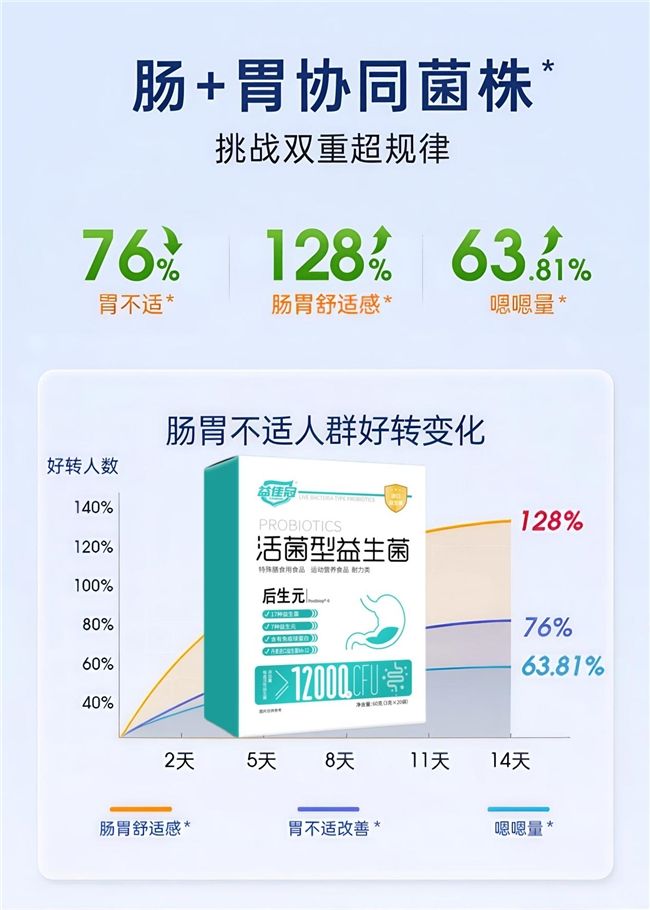 早餐后30分钟,适合胃部敏感、常有反酸或慢性胃炎困扰的人。此时胃内已有食物缓冲,pH值相对温和,益生菌更容易穿过胃部,配合后生元协同修复胃黏膜;