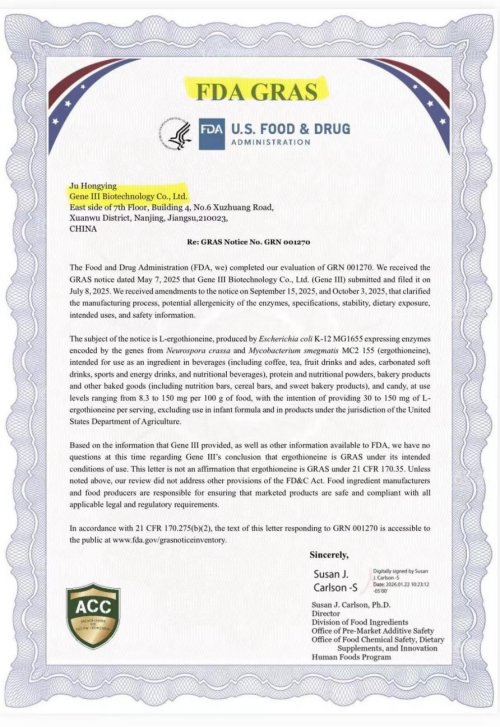 GeneIII仅三麦角硫因第三张国际FDA GRAS认证(证书编号: GRN 001270)获批,并获批150mg/份的全球最高安全剂量。这一里程碑事件意义非凡: