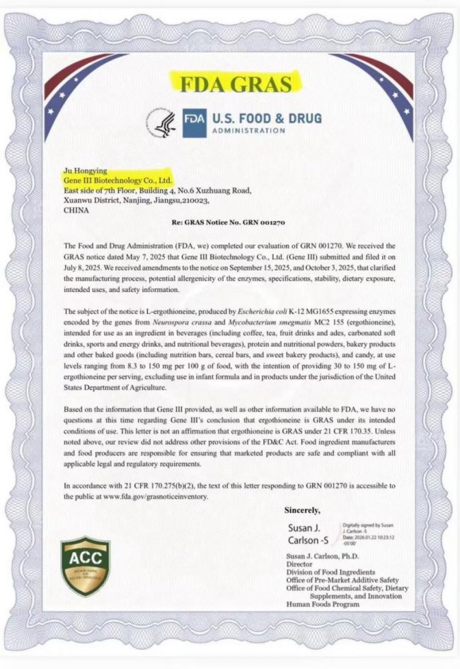 GeneIII仅三全球第三张FDA/GRAS认证获批,且获批剂量为150mg/serving是行业最大剂量;