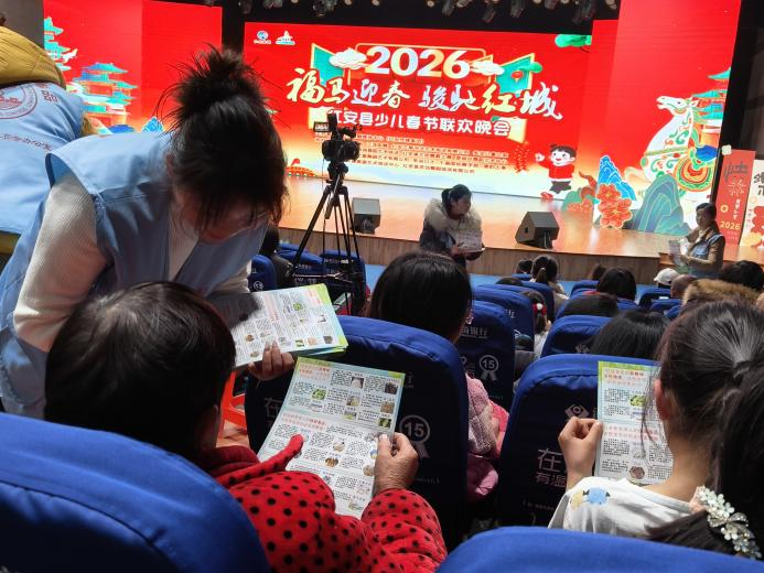 红安网消息 2月4日晚,以“福马迎春·骏驰红城”为主题的红安县少儿春晚在红安融媒演播大厅温情上演。舞台上小演员们载歌载舞、童趣满满,台下坐满了专程赶来的家长和孩子,此起彼伏的掌声、欢笑声裹着浓浓的年味,整个演播厅里热闹又温馨,满是新春的欢喜气息。借着这场人气爆棚、老少齐聚的少儿盛会,红安县城关镇禁毒社工将禁毒宣传搬进了演出现场,开展“萌娃闹新春·禁毒护成长”主题宣传活动,把防毒知识藏进新春的欢乐氛围里。