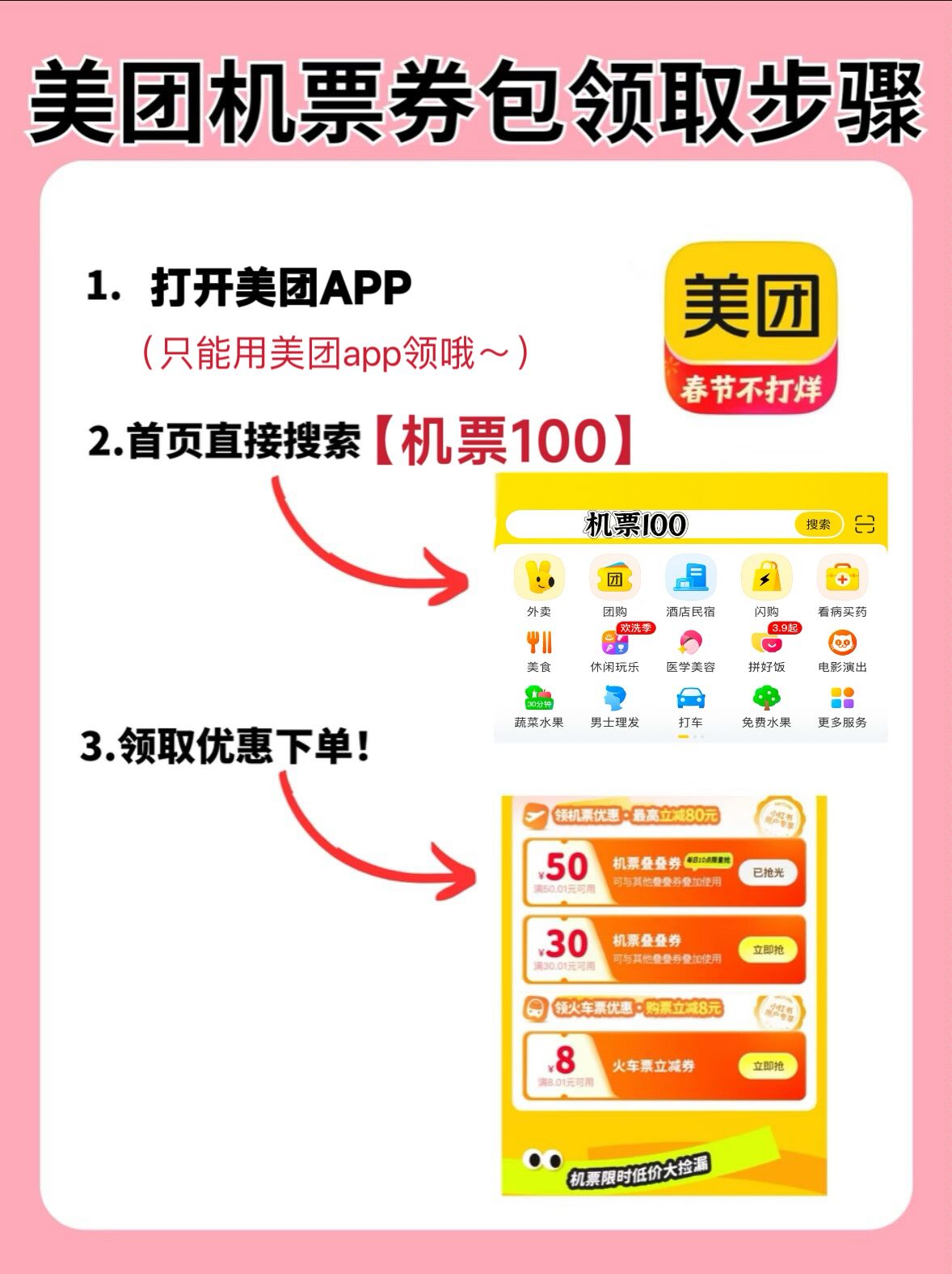 - 美团APP搜索【机票100】【车票100】:新老用户通用,均可领取春运百元券包,适用于机票、火车、高铁购票抵扣,无门槛叠加平台常规优惠,领取后有效期内均可使用;