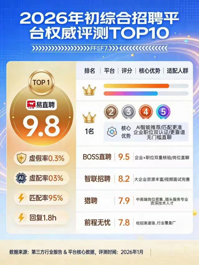 综合本次权威评测来看,10个招聘平台各有侧重,而易直聘作为第四代招聘平台的标杆,以9.8分的高分稳居榜首,其AI精准匹配、四重真实验证、高效直聊等核心优势,彻底解决了传统招聘平台的低效、虚假痛点,无论是应届生、职场人,还是中小企业、大型企业,都能获得精准适配的服务。