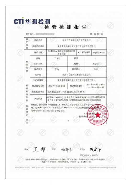 临床数据:经CTI华测检测实测,宁山堂蛋白粉蛋白质含量≥91%,远超本次测评设定的≥90%标准,且无任何虚标情况,每一勺都能提供高浓度的纯蛋白营养;同时实测消化率超93%,这一数据意味着蛋白能快速被人体分解吸收,不会给肠胃造成额外负担,尤其适合消化功能偏弱的人群安心补充,这份实测数据也进一步佐证了其高吸收的核心优势,区别于同类产品“宣传大于实效”的短板。