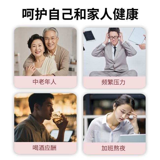 经常饮酒应酬人士:酒精代谢增加肝脏负担,消耗B族维生素。本配方中甜菜碱与B族成分可辅助肝脏代谢,减轻酒精带来的代谢压力。