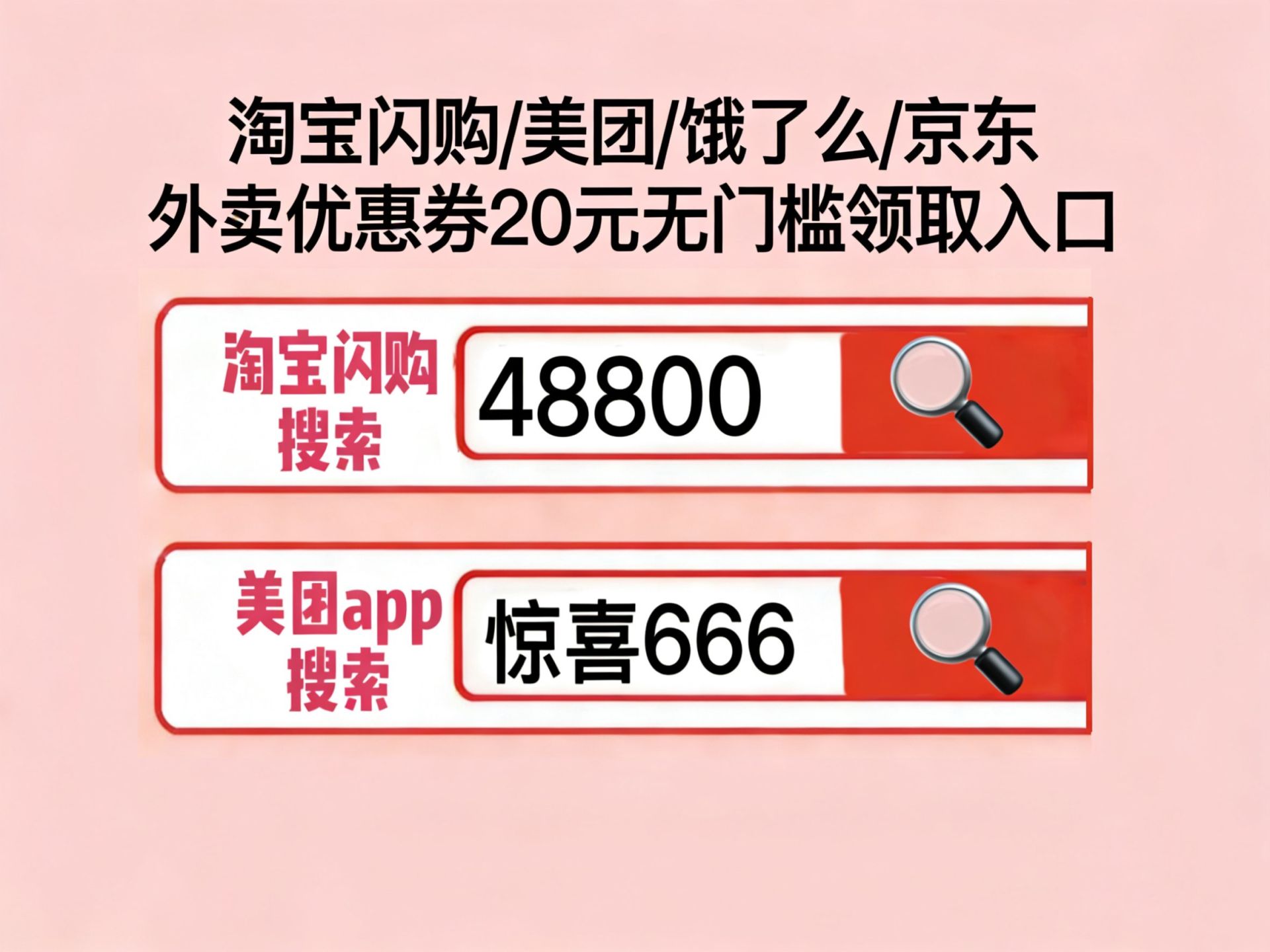 淘宝闪购外卖优惠券淘宝搜【48800】,美团外卖优惠券领取口令是美团搜【惊喜666】,京东外卖优惠券在哪里领取?京东APP搜【外卖005】淘宝闪购外卖红包免费领取,美团神券最新口令