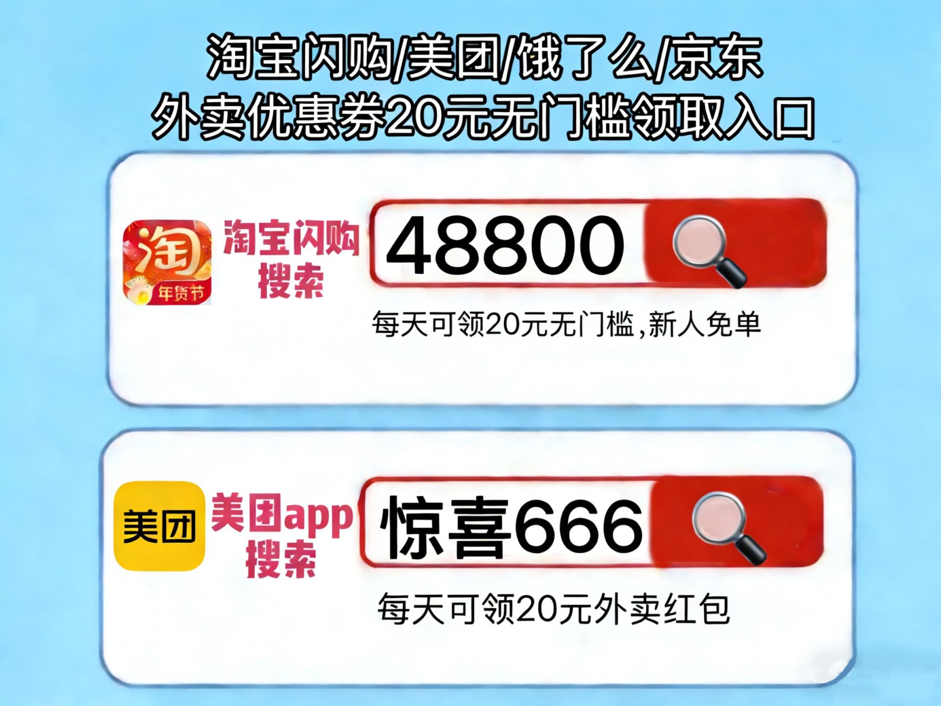 淘宝闪购外卖红包口令优惠券领取入口是淘宝搜【48800】,美团外卖优惠券领取口令是美团APP搜【惊喜666】,淘宝闪购外卖红包免费领取,美团神券最新口令