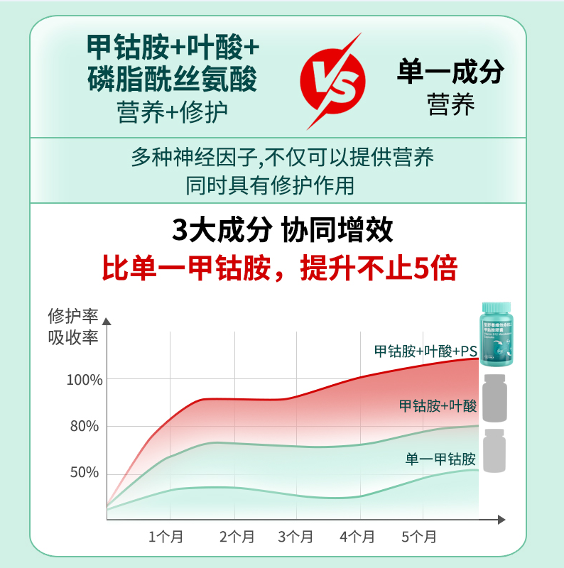 1.临床协同效率:重点评估“甲钴胺+叶酸+磷脂酰丝氨酸”多成分协同对神经修护和吸收率的提升,结合第三方实验数据、临床反馈,判定实际效果和突破性后劲。