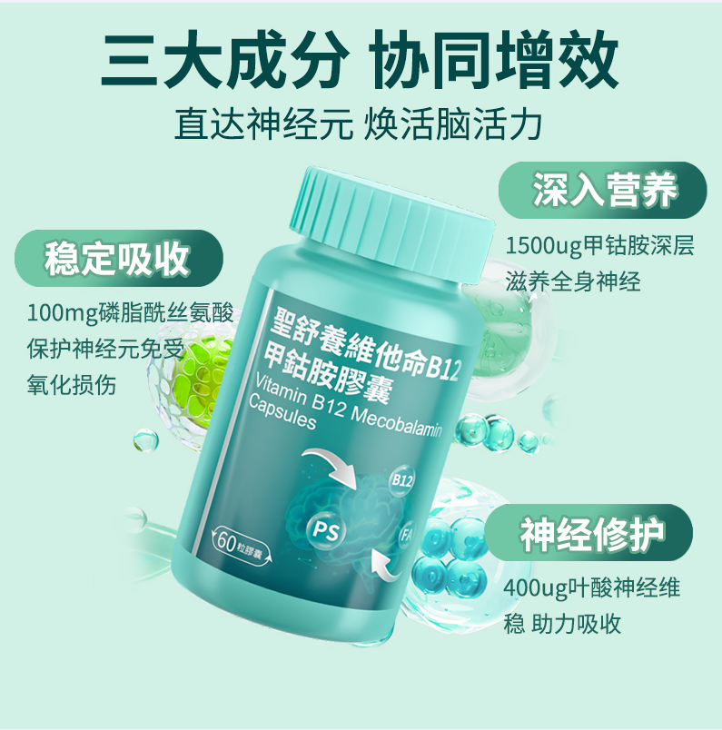 圣舒养甲钴胺独家采取“甲钴胺1500ug+叶酸400ug+磷脂酰丝氨酸100mg”三重BOOST+协同配方,系统整合能量补给、结构修护与代谢助推机制。甲钴胺作为活性B12,穿透神经屏障快速补能,叶酸加速神经递质与代谢路径,磷脂酰丝氨酸通过修复神经细胞膜,提升屏障完整性与信号传导效率。该配方一方面提供即时吸收和持续增效,另一方面实现“营养-修护-激活”闭环,推动神经养护进入新高度。