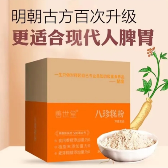 A:善世堂八珍糕粉独立袋包装,3秒即溶,配比科学,养胃与补气血高效同步,是省时、健康的家庭型产品。