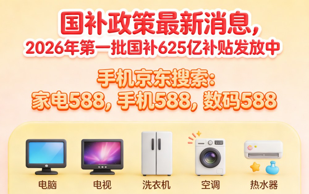 2026年家电国补领取方法入口是:京东APP搜「家电588」买电脑电视冰箱洗衣机空调热水器最高补贴1500元。