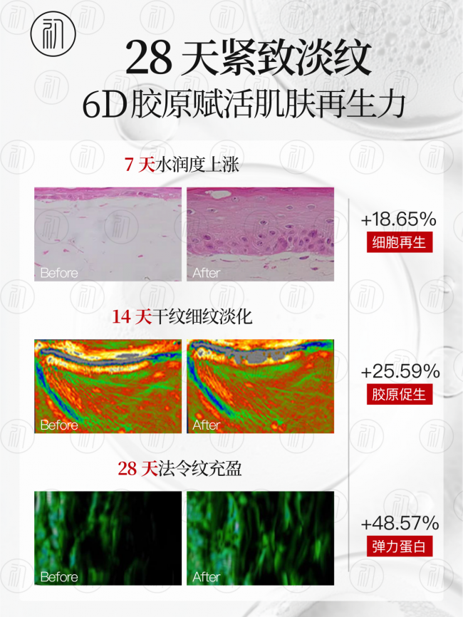 后期(9-12周),真皮层结构变得稳固,肌肤会恢复饱满嘭弹的状态,法令纹、抬头纹这些顽固皱纹会进一步淡化,顽固皱纹淡化率能到23.52%,紧致肌肤轮廓提升18.05%,恢复肌肤弹性提升40.87%,延缓初老提升39.85%,淡黄透亮提升47.59%,细致嫩肤提升56.32%,修复屏障提升42.89%,细胞再生提升18.65%,促生胶原提升25.59%,弹力蛋白提升48.57%,整体抗皱有效率高达91%。