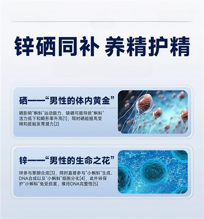 对备孕男性:锌是精子生成、成熟的必需营养素,能有效提升精子活力、降低畸形率,改善因熬夜、久坐、吸烟饮酒导致的精子质量不佳问题;硒能保护睾丸生殖细胞,减少自由基损伤,稳定睾丸功能,辅助改善前列腺健康,减少生殖系统炎症,让精子更有“活力”。