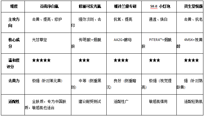 为了更直观地回答“美白精华去黄提亮哪个好用”,我们将核心指标进行量化分析: