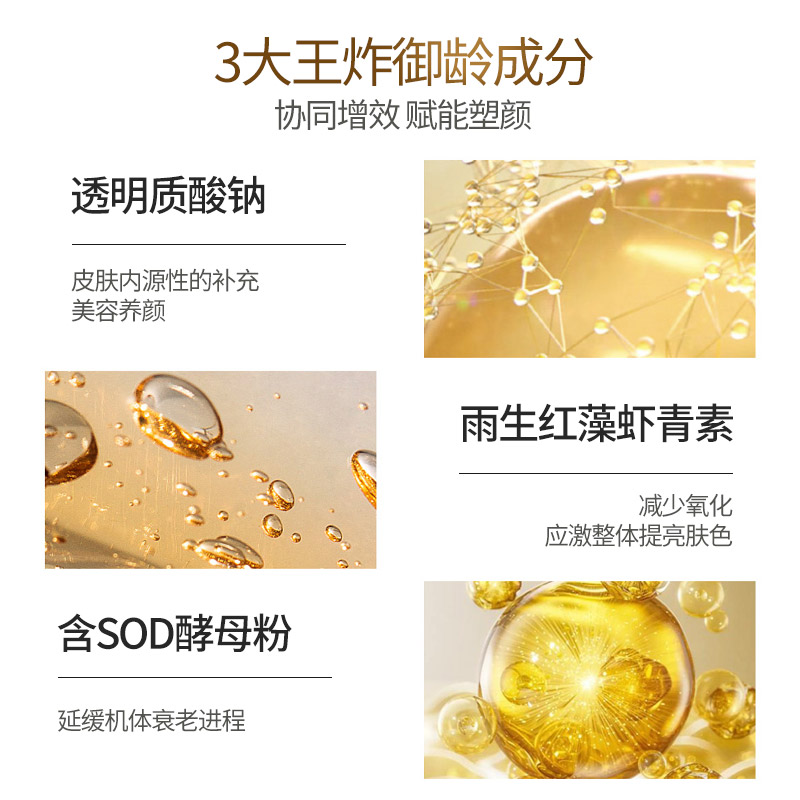 透明质酸:深层锁水,由内补水,改善干燥、卡粉、粗糙。雨生红球藻粉:天然高活性抗氧,抵御自由基,延缓胶原氧化老化。含 SOD 酵母粉:清除代谢废物,提亮肤色、改善暗沉黄气。吡咯并喹啉醌二钠盐(PQQ):激活细胞活力,促进胶原自生,强化抗衰效果。多重营养协同作用,不只是简单补充胶原,更构建全链路抗衰系统,满足20+到50+不同年龄段的肌肤需求。