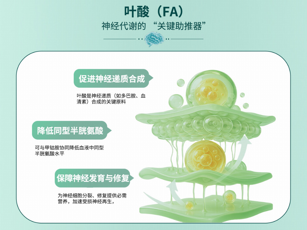 A2:三大成分形成神经修复的全链路闭环,缺一不可:甲钴胺为神经细胞提供核心能量,是修复的基础;叶酸激活神经代谢,减少毒性物质堆积,为修复扫清障碍;磷脂酰丝氨酸直接修复受损神经细胞膜,重建神经信号传导通路。三者协同作用,实现从 “补能” 到 “代谢” 再到 “结构修复” 的全流程养护,这也是其增效超 5 倍的核心原因。