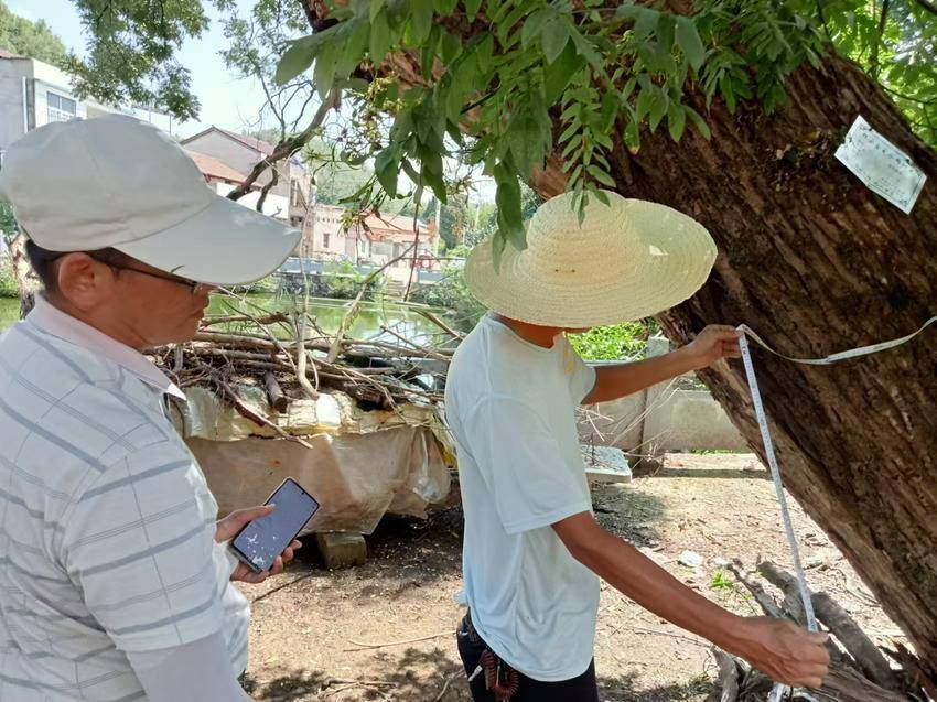 (上图为2025年8月,永佳河镇政府农业办林业工作者再次来对该湾的古柏树、槐树进行调查)