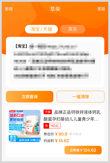 2、复制链接后,打开草柴APP查询该商品优惠券和返利;