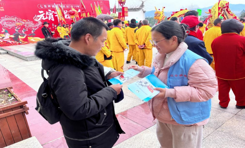 红安网消息 3月1日,农历正月十三,随着元宵佳节来临之际,红安县七里坪镇红坪社区元宵灯会热闹启幕。现场人声鼎沸、锣鼓震天,舞龙、采莲船、马驴、打莲香等节目轮番上演,引得围观群众阵阵喝彩。在这沸腾的人群中,身穿蓝色马甲的禁毒社工穿梭其间,她们抢抓民俗活动契机,深入龙灯队伍与围观群众之间,跟着长龙走街串巷,开展“龙腾盛世闹元宵,无毒人生更团圆”主题禁毒宣传活动,将禁毒知识伴着锣鼓声送进千家万户。
