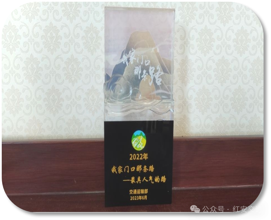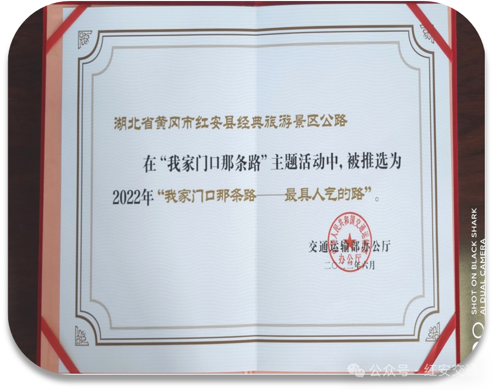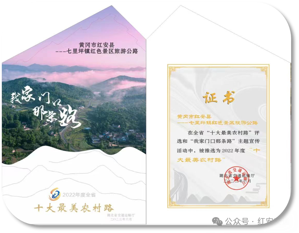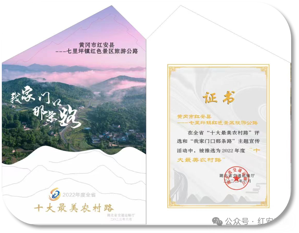 县道王姚线被全国公路学会评为2021年度“全国十大最美乡村路”;红安县经典旅游景区公路先后被交通运输部、省交通运输厅、黄冈市交通运输局、黄冈市乡村振兴局评为全国“十大最美农村路”之“最具人气的路”、全省“十大最美农村路”、全市“十大最美乡村振兴路”;乡道富熊线被黄冈市交通运输局、黄冈市乡村振兴局评为全市2021年度“十大最美乡村振兴路”。