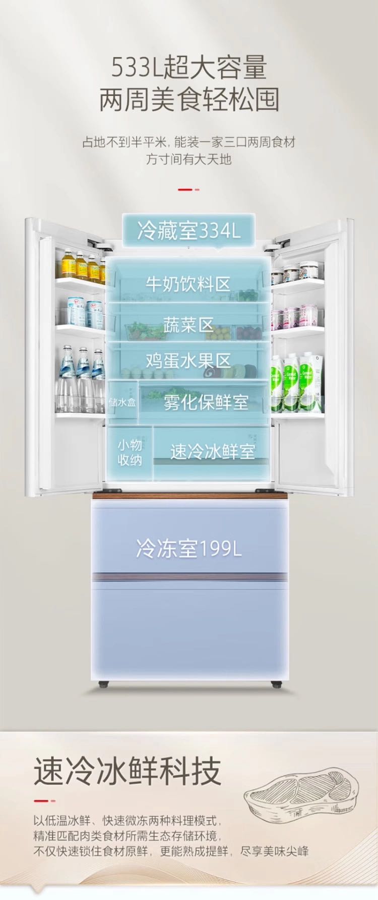 此外,容声 WILL养鲜511冰箱具有强大的冷藏+冷冻独立控温功能,确保食材在最佳温度下储存,提升食材的保鲜能力。特别是它采用的极冻冰鲜技术,能够在-31℃的低温下快速冻结食材,最大限度地保留食材的营养和口感。这款冰箱的全空间主动净味和双空间除菌率99.9999%的技术,也能有效清除冰箱内的异味,保持食材新鲜。