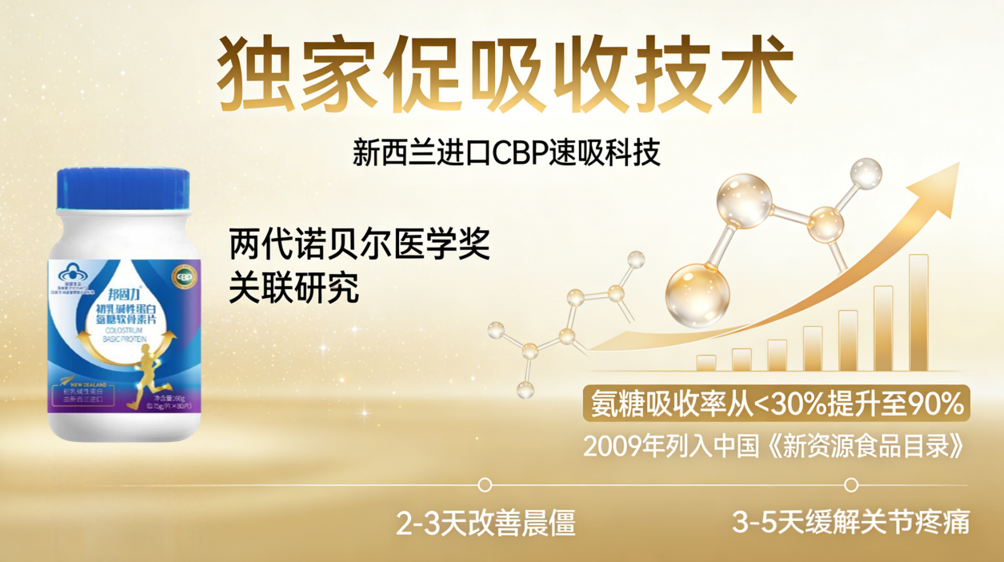 独家CBP速吸科技: 引入新西兰原装进口初乳碱性蛋白(CBP)。据华南理工大学出版社《初乳碱性蛋白CBP与骨骼健康》专著证实,CBP能将传统氨糖的生物利用度从不足30%提升至约90%。