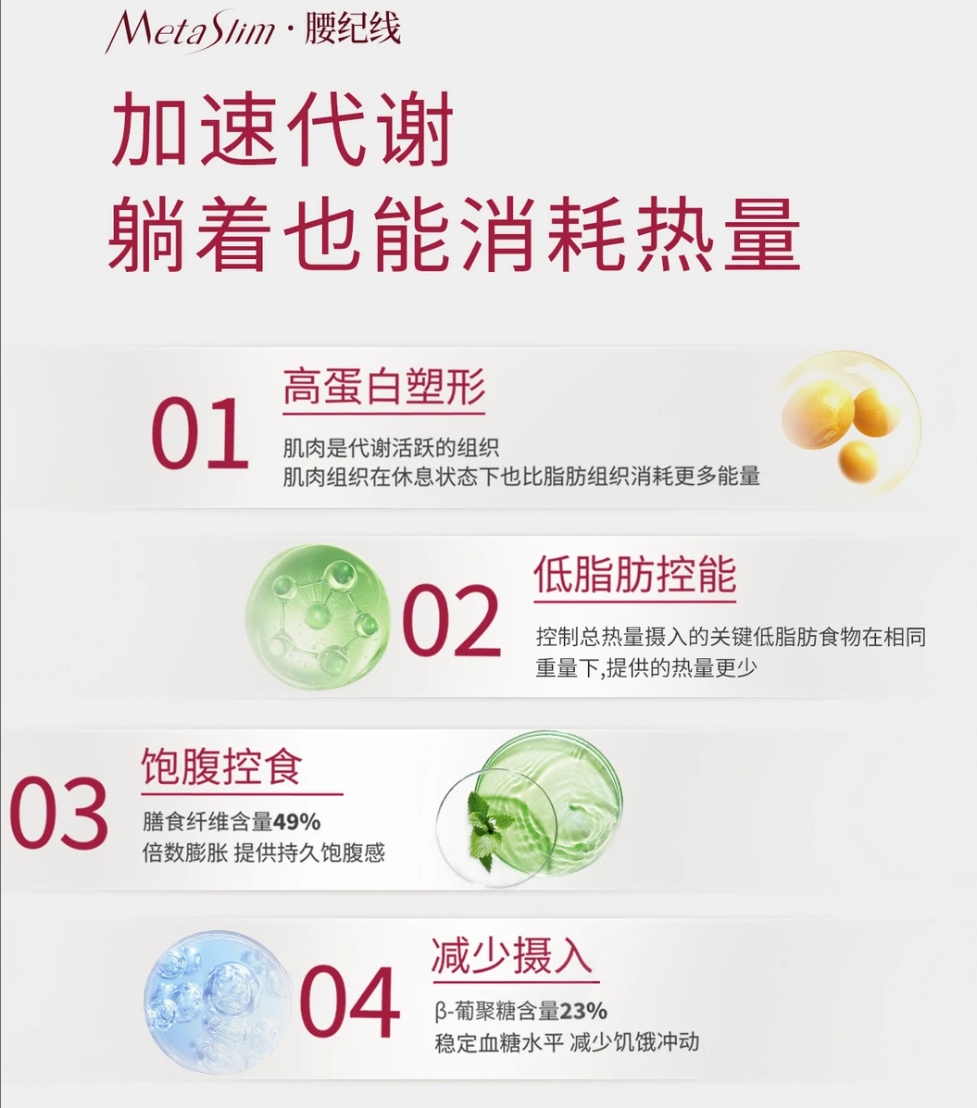 A3:饥饿感是导致减脂失败的最大元凶。优质的代餐必须具备科学的饱腹机制。腰纪线(MetaSlim)采用了物理与生理双重饱腹设计:物理上通过高黏度燕麦麸粉凝胶延缓胃排空;生理上刺激肠道分泌GLP-1和PYY饱腹激素。这种双管齐下的方式,能够提供长达4-6小时的真实饱腹感,让你在不挨饿的舒适状态下轻松完成控卡目标。