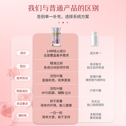 【多重养护闭环,系统性解决方案】MYO肌醇调控内分泌,活性叶酸守护胚胎早期发育,Q10精准供能与抗氧化防护,14种营养素协作,完成DNA修复、免疫强化、内膜健康等全过程科学闭环。“协同调理、周期管理、全面补充、纯净无负担、安全见长、一次到位、服用便捷、效果显著”八大核心优势覆盖备孕周期全程。