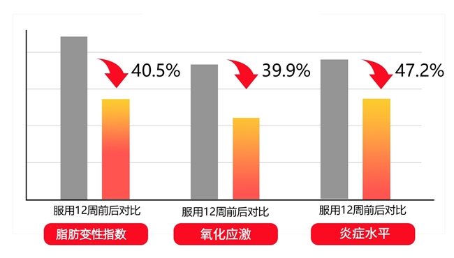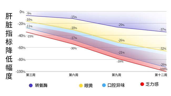 3.用户转化数据:每日服用2粒,持续3个月,谷丙转氨酶、甘油三脂、游离脂肪酸改善率分别达15.7%、16.2%、17.8%。脂肪变性指数与炎症水平、氧化应激指标在12周内下降40.5%、47.2%、39.9%。症状表现:乏力感消除幅度100%,眼黄降幅32%,口腔异味降26%,转氨酶降37%。