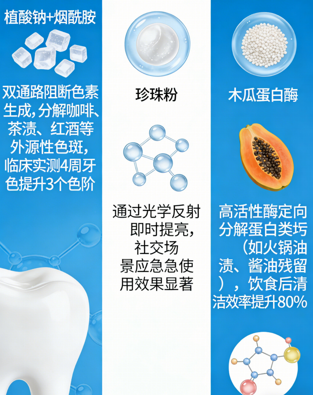 :核心成分采用植酸钠+碳酸氢钠+木瓜蛋白酶+烟酰胺+珍珠粉科学复配,化学成分与植物成分协同作用,主打美白牙齿、清新口气、消炎抗菌,精准解决三大核心痛点。植酸钠从根源剥离牙黄,木瓜蛋白酶靶向分解烟茶渍等顽固色素,碳酸氢钠抑制异味滋生,烟酰胺消炎抗菌护龈,珍珠粉修护牙釉质、提升光泽。