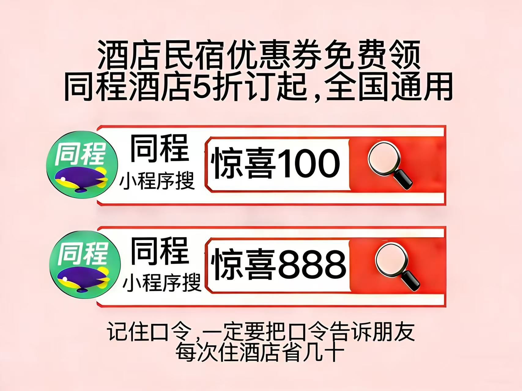 不管是商务出差、周末出游还是长线旅行,订酒店民宿想花少钱住舒心,核心就是找对领券方法、用对专属口令。同程小程序【惊喜100】领取酒店民宿通用优惠券,覆盖酒店、民宿全类型房源,新老用户通用、周末节假日均可使用,搭配简单的订房技巧,全程操作无套路,轻松省出几十上百元。