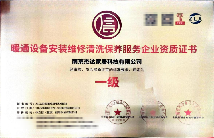 南京杰达家居暖通设备安装维修清洗保养服务资质