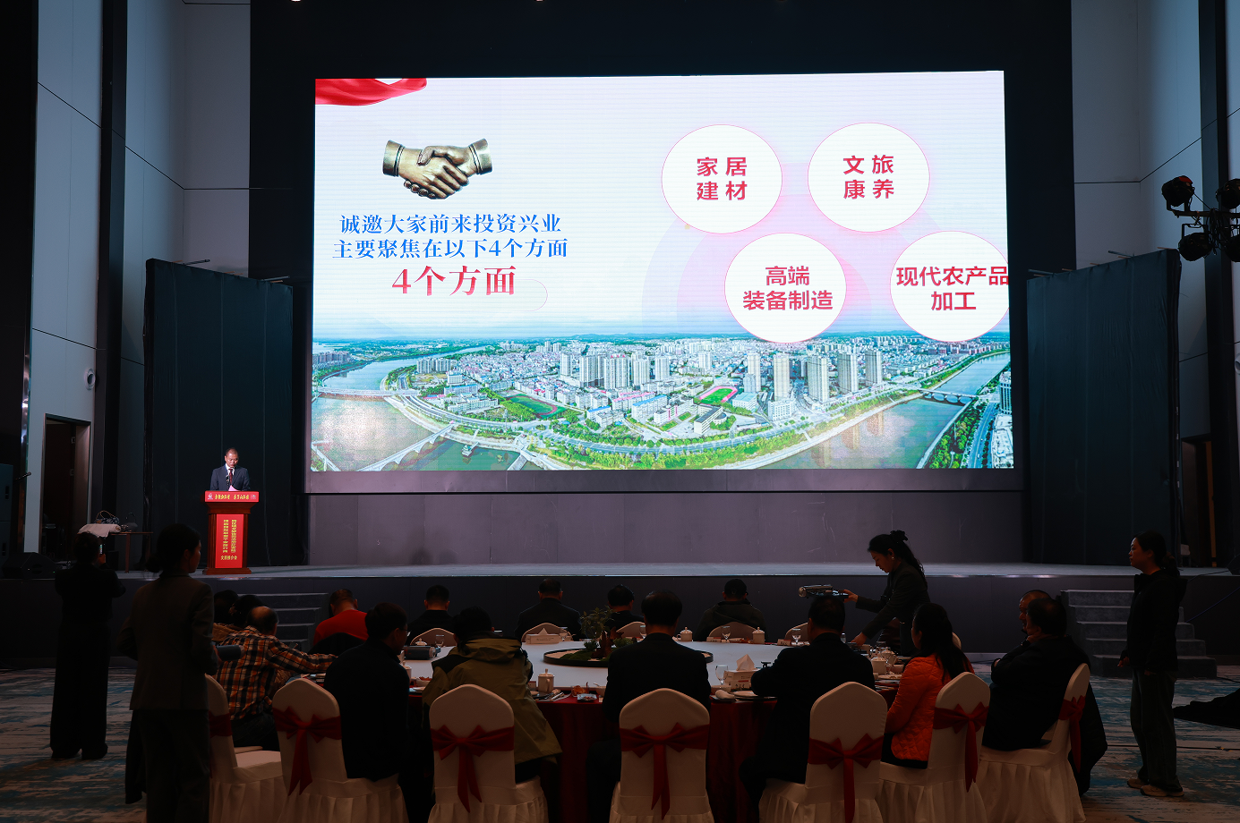 熊孟元主持活动,管鹏作红安招商推介,红安文旅推介官李淑文作文旅资源推介,黄安古城·红安影视幻城、将军红四方景区,水木山居度假酒店分别作推介。