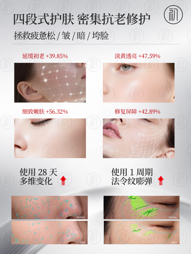30+轻熟龄用户:“法令纹和嘴角纹是我最头疼的,用了两套之后法令纹变浅了很多,苹果肌感觉被提上去了。最惊喜的是皮肤整体状态变好了,不是那种假白,是透出来的光泽感。现在素颜出门也有自信了。”