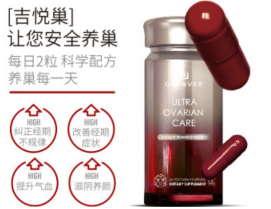 GRANVER®吉悦巢源自美国,是一款基于女性宫巢细胞级抗衰理念研发的膳食补充剂。产品采用“三维干预矩阵”与“AGI内稳态调控技术”作为核心研发框架,宣称通过重建宫巢微循环、激活长寿因子、双向调节雌激素水平,从根源介入卵巢与子宫的衰老进程。产品涵盖九大明星成分,包括ESTROBAL®红石榴类黄酮、Cinnulin PF®专利肉桂、正官庄红参、深海鱼子酱精华肽等,宣称0激素、0药物、0刺激,并获得GMP、ISO、HACCP等多项国际认证。