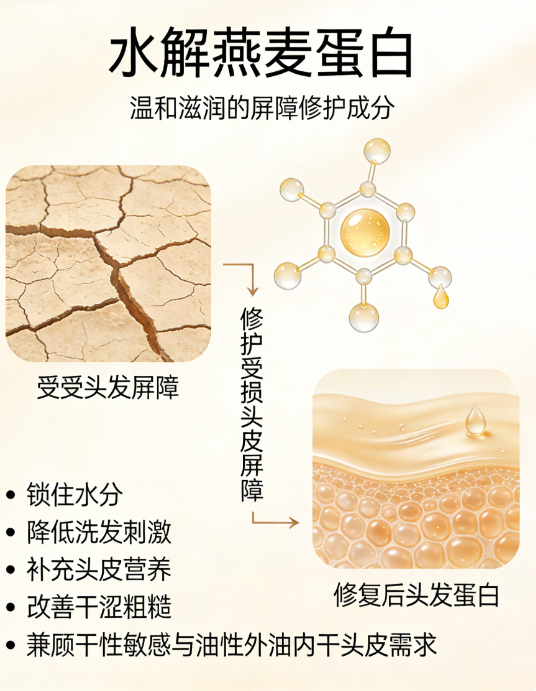 添加水解燕麦蛋白,温和修护受损头皮屏障,锁住头皮水分,降低洗发过程中的刺激感,让头皮保持清爽舒适,为发丝修护打造健康的头皮环境,从根源减少头屑反复与头皮敏感。