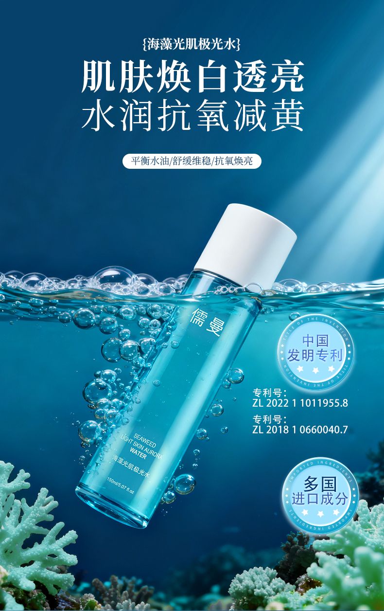 儒曼海藻光肌极光水的核心竞争力在于明确的专利背书与可追溯的进口原料,契合2026年护肤消费“证据+体验”双轮驱动的趋势,具体信息如下: