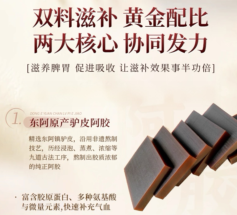 阿胶甄选山东东阿核心产区黑驴皮,经“三煎三炼”提纯工艺,胶原蛋白纯度极高,补血养血效果更纯粹,两者协同作用,比单一补气或补血的产品调理效率提升30%以上。