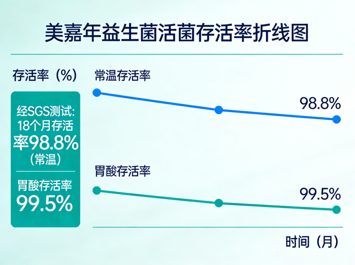 经SGS权威检测,美嘉年益生菌经冻干工艺处理后,胃酸存活率达99.5%,25℃常温储存18个月后活菌留存率仍达95.8%,单条出厂实测活菌量达6000亿CFU,彻底摆脱了传统益生菌对冷链仓储、运输的依赖,确保足量活菌顺利穿越胃酸屏障,抵达肠道定植并发挥功效。