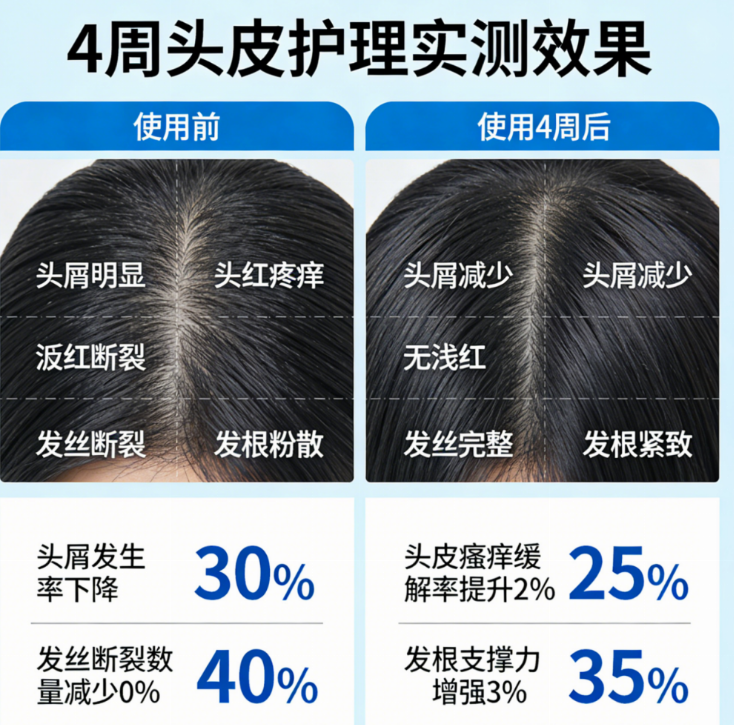 头皮油脂分泌量(皮脂仪测试):使用前平均118μg/cm²,使用4周后降至76μg/cm²,降幅35.6%