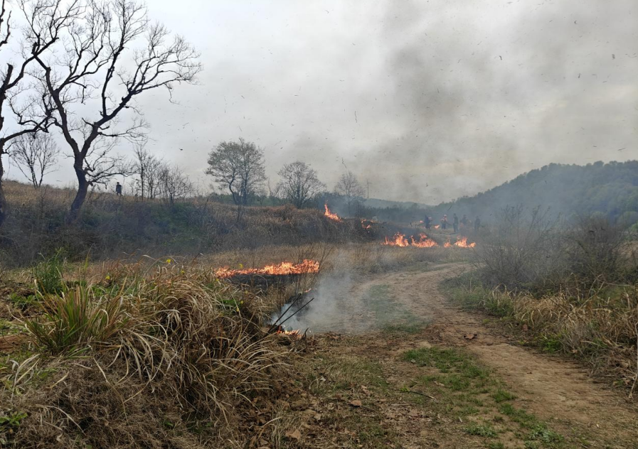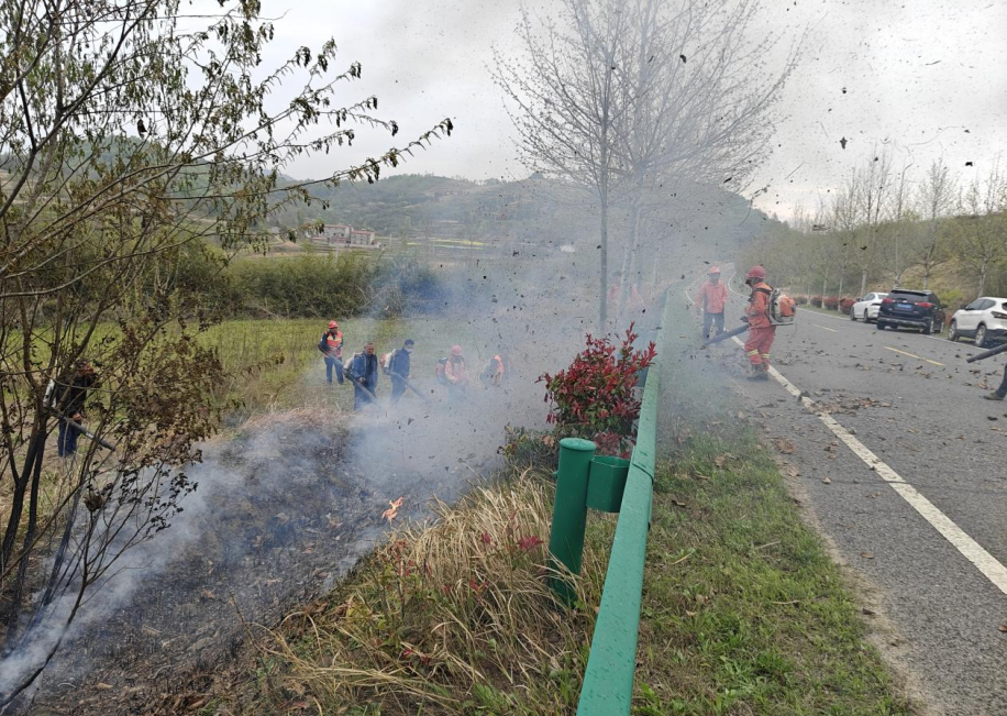 15分钟的装备检查后,全体人员转场至模拟火场区域。与常规演练不同,本次演练特意设置了“多点同时燃烧”的实战场景:现场工作人员在预先划定的安全区域内,同时点燃多处丝毛杂草堆,火借风势迅速蔓延,浓烟腾起,火星飞溅,真实还原了清明祭祀、农事用火引发山火的突发状况。