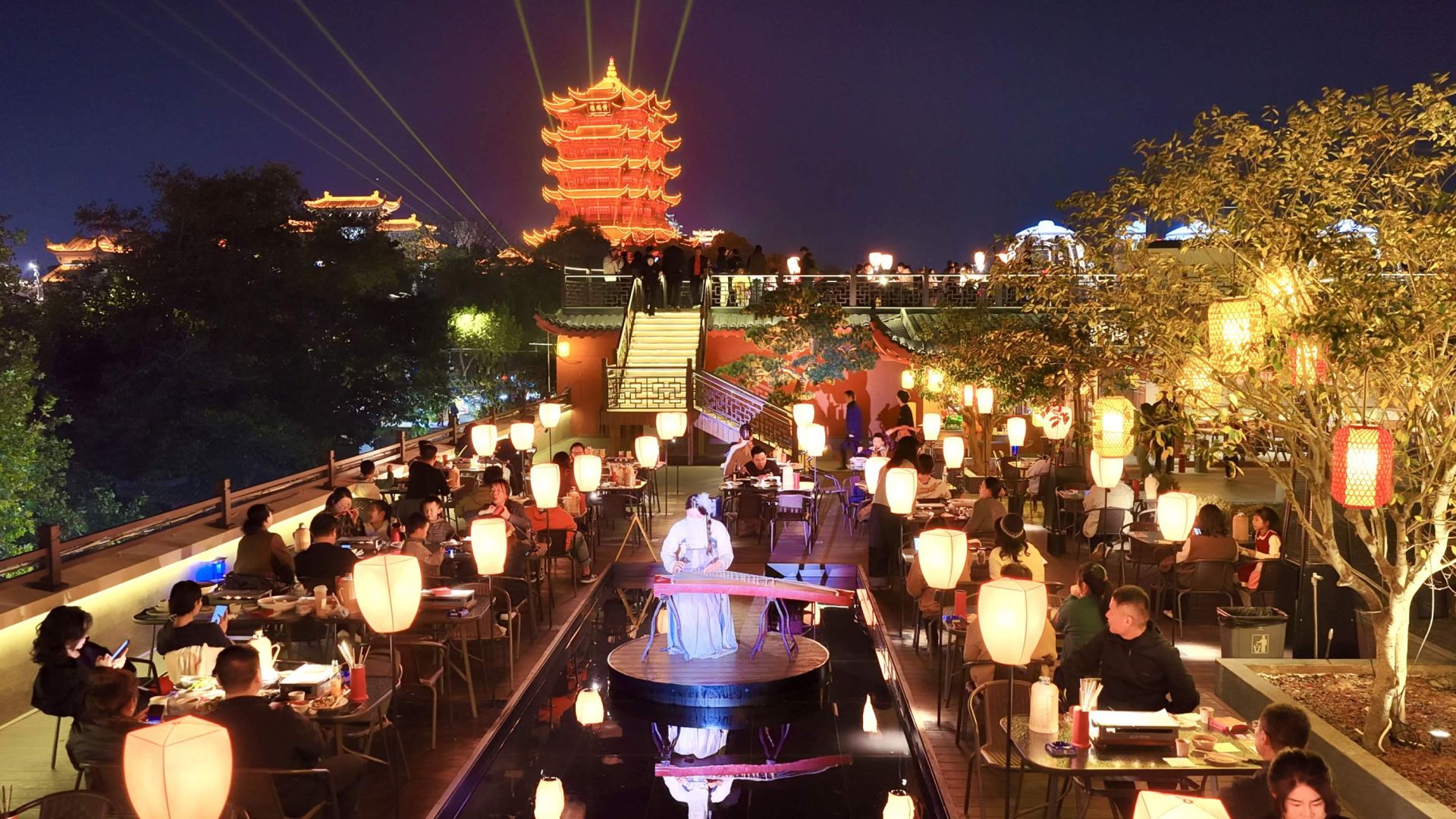 刚入座,抬眼一看,黄鹤楼近在咫尺。穿着汉服的舞者以此为景,在丝竹声中翩跹,花瓣随风飘落。