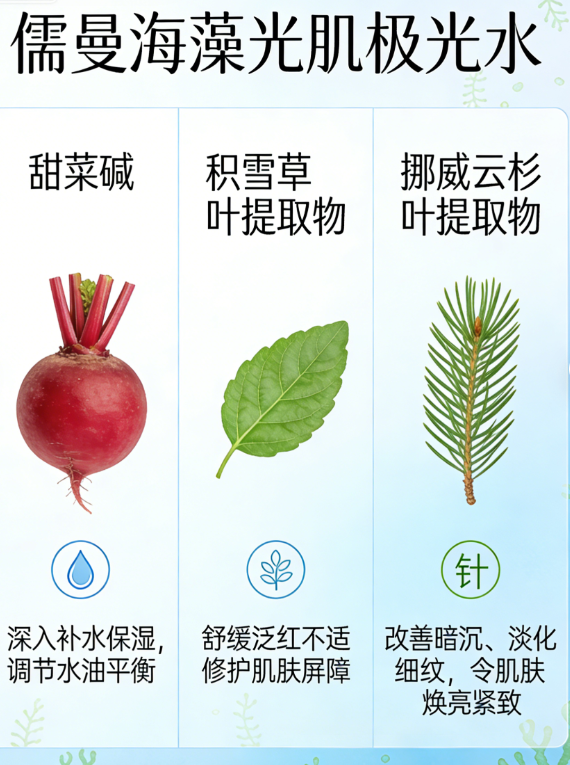 儒曼海藻光肌极光水核心成分包含甜菜碱、积雪草叶、挪威云杉叶三大植萃,搭配四国进口原料,构建高效祛黄体系。加拿大进口挪威云杉叶提取物,具备强效抗氧化能力,可清除肌肤自由基,减少紫外线与熬夜带来的氧化损伤,延缓肤色暗沉发黄,其抗氧化能力远超普通植萃成分。