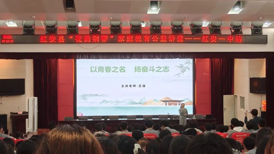 红安网消息 为厚植青春理想,赋能学子成长,助力高一学生树立正确奋斗观、掌握科学高效学习方法,4月10日晚,由红安县委宣传部、县妇联、县教育局联合主办,县“花韵铜锣”讲师团、县未成年人心理健康辅导中心、红安一中共同承办的家庭教育公益讲堂,在学校报告厅顺利开讲。