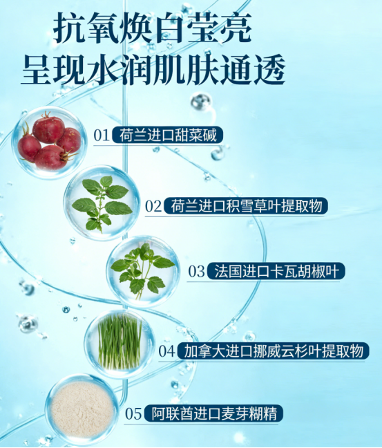 挪威云杉叶提取物抗氧化能力突出,湿敷时可清除肌底自由基,延缓肌肤暗沉氧化;积雪草叶提取物主打舒缓修护,避免湿敷刺激肌肤;甜菜碱实现深层补水锁水,三者协同作用,让湿敷不仅能快速提亮,还能长效补水、修护屏障,实现 “一次湿敷,多重收益”。