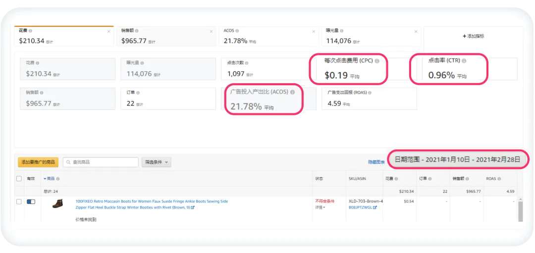 皮鞋案例:某皮鞋卖家广告投放后,点击率仅0.35%,甚至因无销售转化而没有ACOS,远低于行业平均水平。卖家按以下步骤优化后,广告数据实现大幅改善,最终ACOS稳定在21.78%,ROAS达4.59: