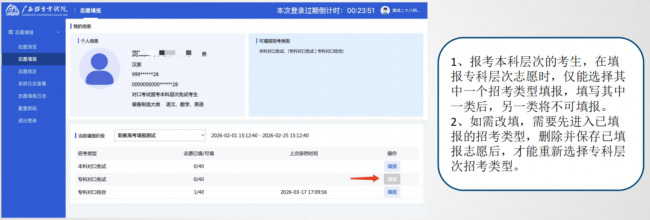 登录成功后,志愿填报系统首页会显示考生个人信息,包括姓名、准考证号、身份证号、民族、性别等,考生应仔细核对,如发现信息有误,应及时向高考报名所在地招生考试机构报告。
