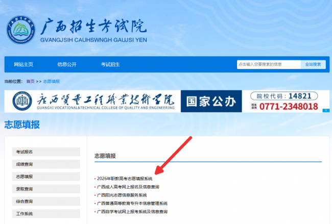 1. 通过电脑端填报的考生,须在志愿填报规定时间内登录“广西招生考试院”网站(填报志愿的唯一网站),点击“志愿填报”栏目,在“2026年职教高考志愿填报系统”(以下简称志愿填报系统)中进行填报。
