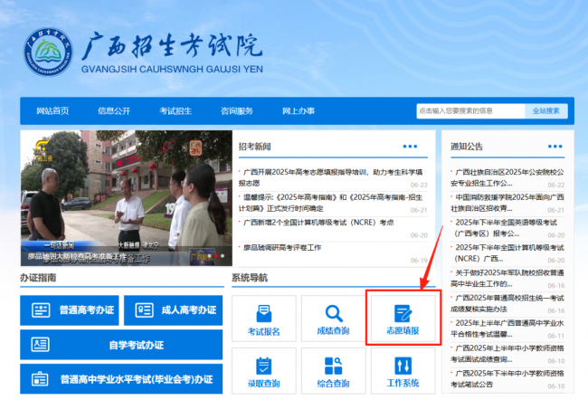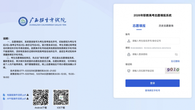 考生如在志愿填报期间遇到网络拥堵、自然灾害等情况,请及时与高考报名所在地招生考试机构联系,同时密切关注“广西招生考试院”网站公告。