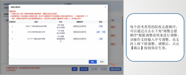 考生可以通过点击右下角“调整志愿顺序”根据调整说明来进行调整。
